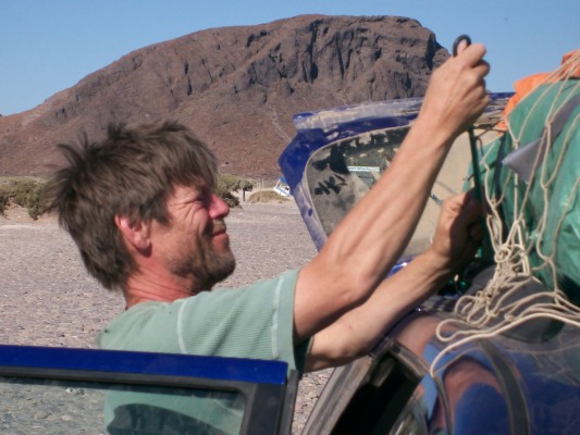 kept that thing on the roof for the rest of the trip - i plan to build a plywood cartop box to simplify things for future trips, the construction of which became prime woodshedding campfire material for don roberto and el gregorio -